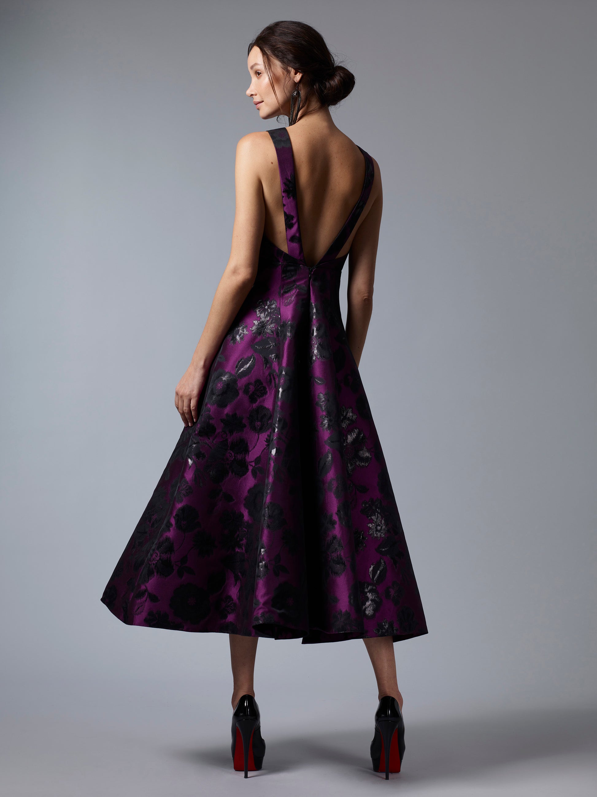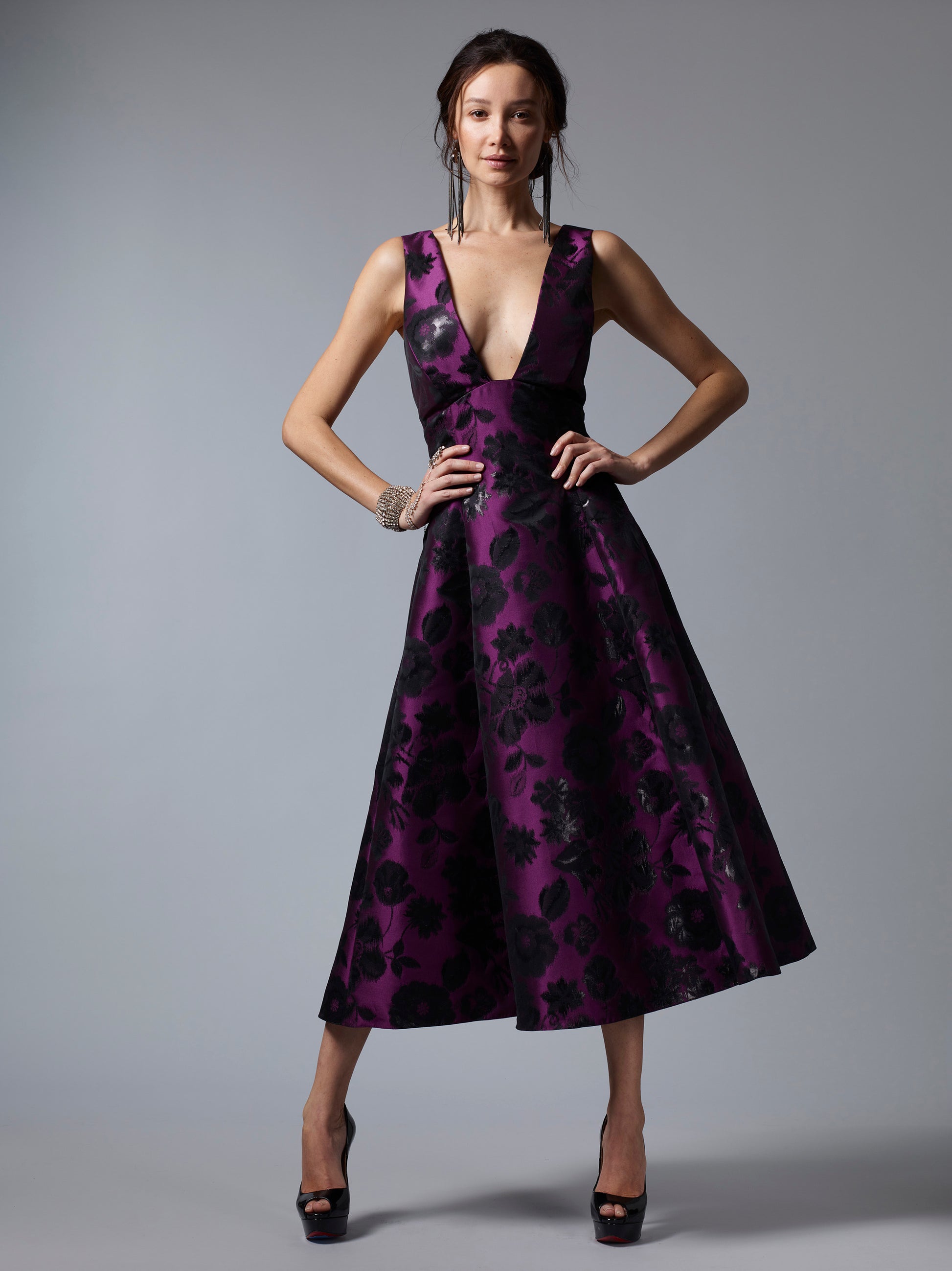 A take on our popular Alice dress, Dottie is our midi version in a beautiful lacquered jacquard. Her full aline skirt, and plunging neckline make you look timeless and elegant all night long.